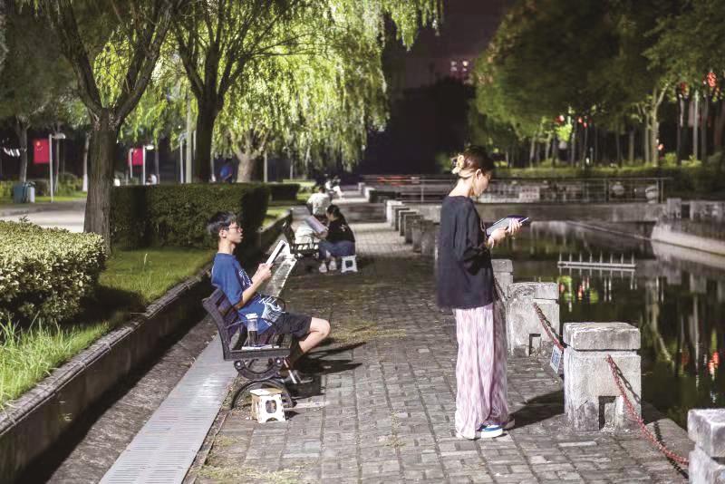 近日,每当夜幕降临,可听见武汉华夏理工学院的图书馆附近书声琅琅,几十名考研学子们在路灯下背书复习。