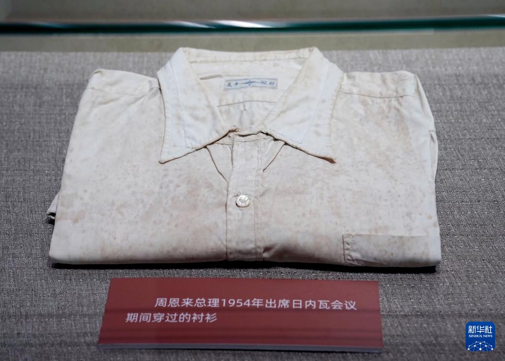 9月26日在展览上拍摄的周恩来总理1954年出席日内瓦会议期间穿过的衬衫。新华社记者 刘颖 摄