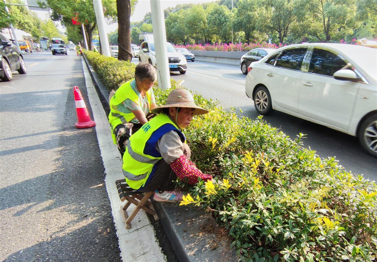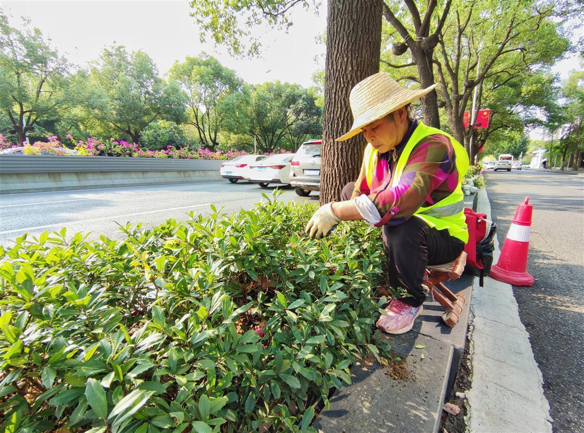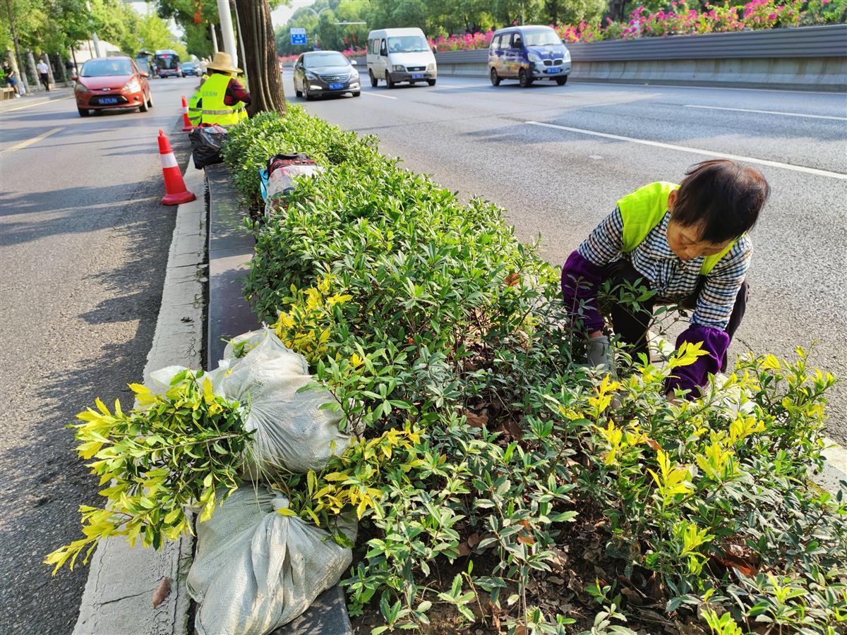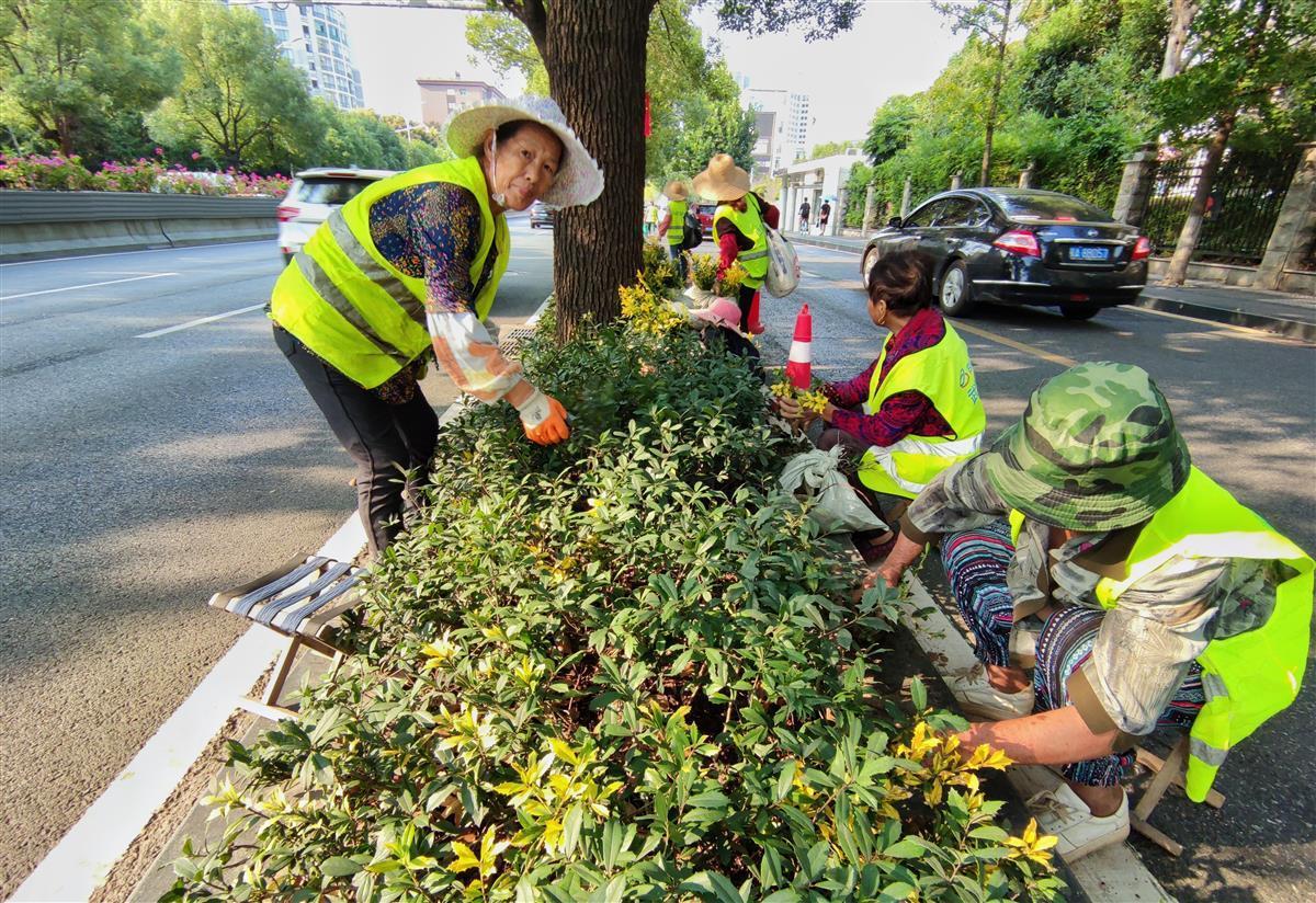 9月27日,在武汉大道上,园林工人们正在路边花坛内补栽黄金枸骨,准备迎接国庆的到来。