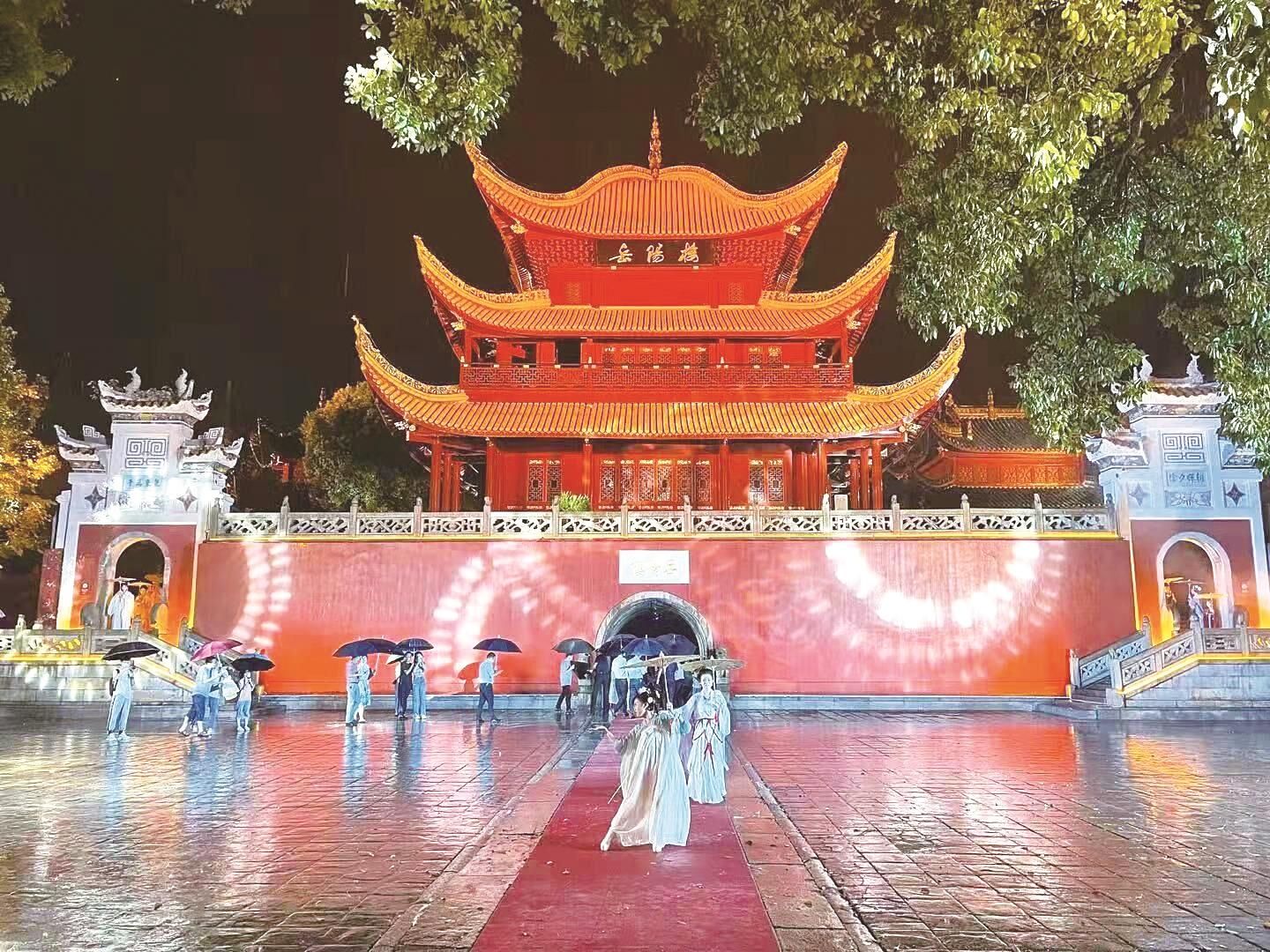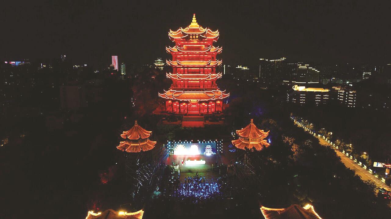 当晚8时,湖北黄鹤楼、江西滕王阁、湖南岳阳楼同时点亮。江南三大名楼灯火璀璨,穿越时空,遥相辉映。