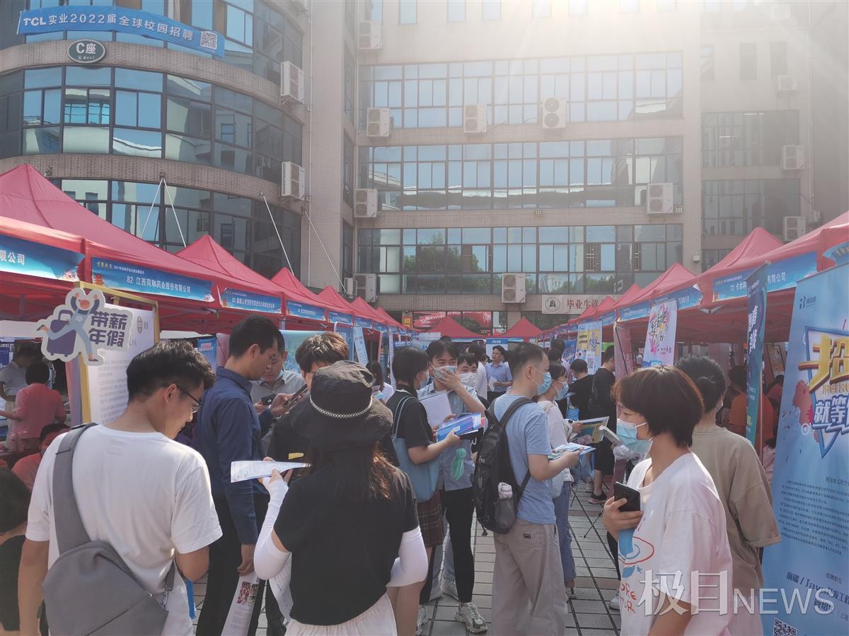下午2点30分,烈日炎炎,但一点也不影响同学们求职的热情。前来求职的学生们经过扫码、测温、消毒后,进入湖北大学逸夫楼前广场的招聘现场。