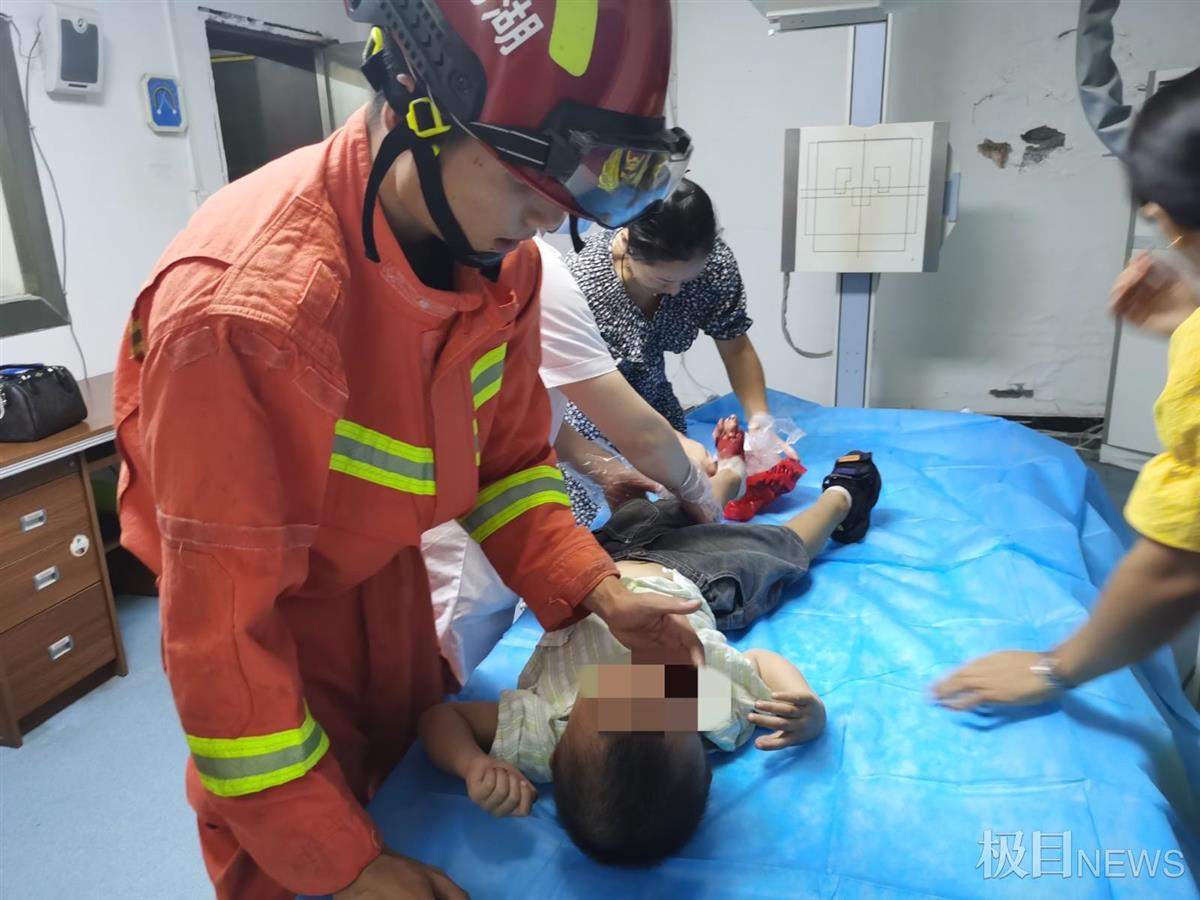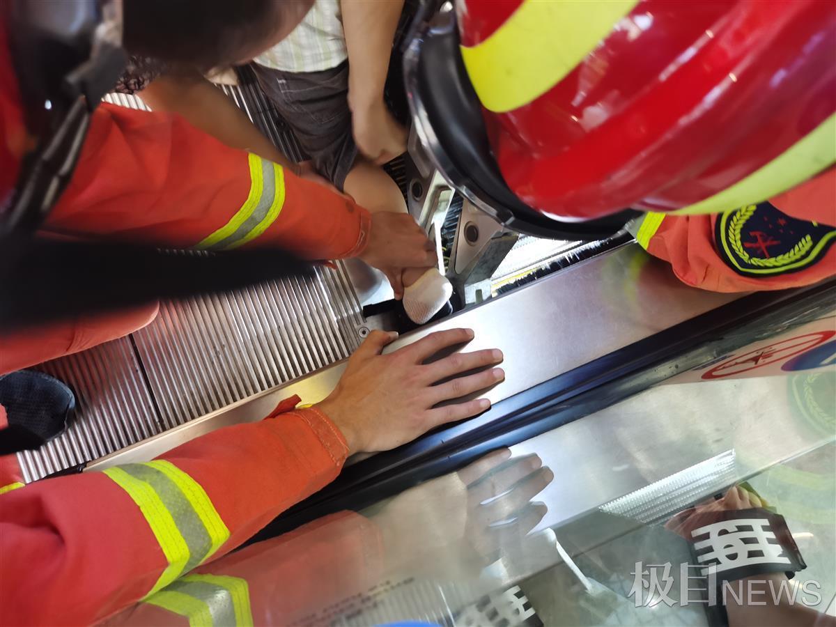 5分钟左右,男童被自动扶梯“咬”住的左脚顺利脱困。救援人员发现男童左脚脚趾有断裂,考虑到救护车尚未到达现场,消防队员立即抱起男童用消防车护送前往医院救治。
