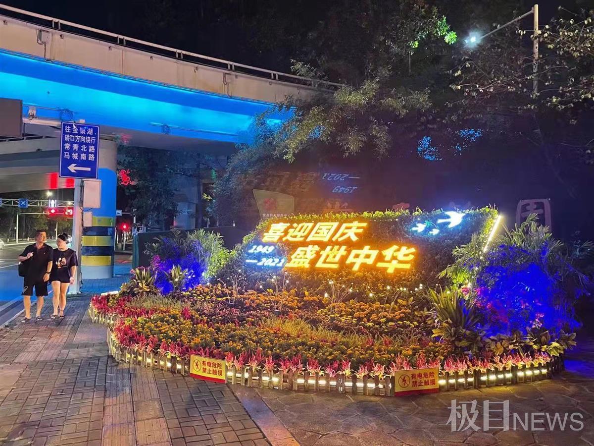 国庆节前夕,武汉东西湖区常青花园街头,摆放了多处不同主题的花卉景观,鲜花与霓虹相映,为常青花园增添了一道美丽的风景线,喜迎国庆的氛围感也愈发浓厚。