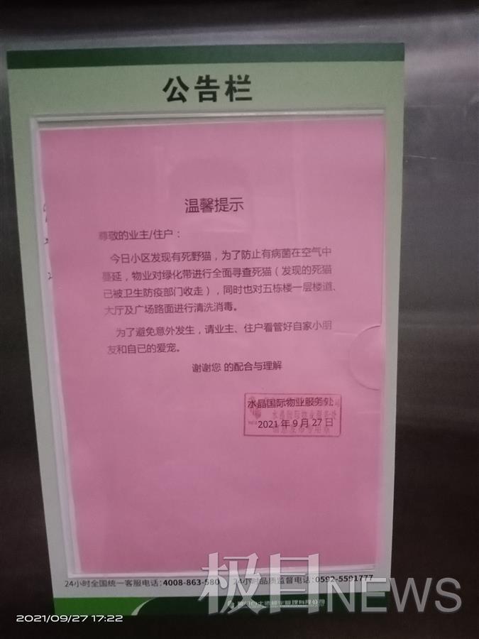 28日,水晶国际小区物业相关负责人荆先生告诉极目新闻记者,他们此前多次接到业主投诉,表示小区内有大量野猫出没,对业主的生活造成影响。26日物业张贴了一份通知,告知业主不得投喂野猫。“我们刚贴通知不能投喂野猫,第二天就死了好几只,还有人以为是我们物业投毒。”荆先生说,物业在26日已经在联系动物救助站和购买诱捕笼,准备清理小区内的流浪猫,但没想到会出现这种情况。
