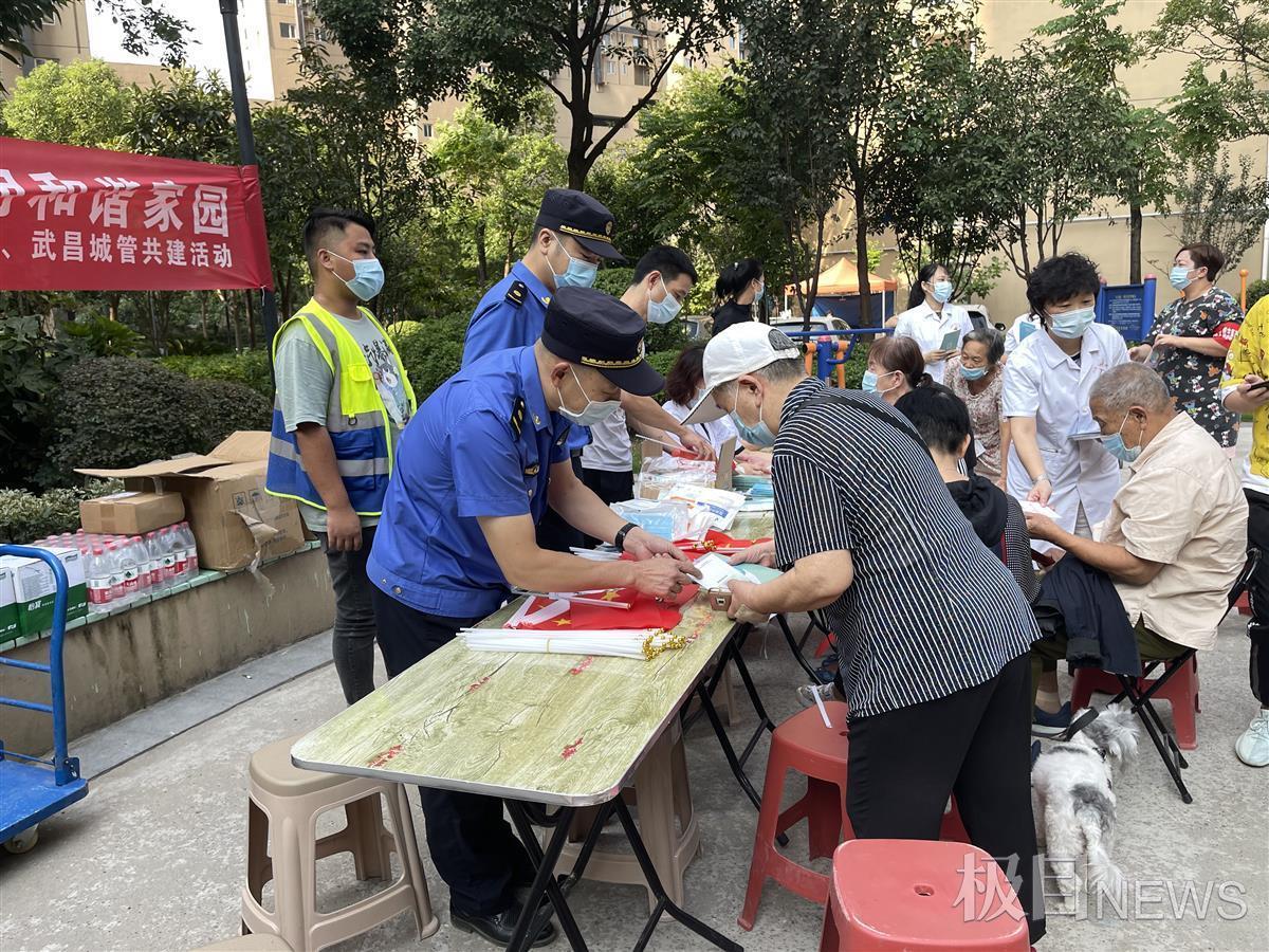 武汉市第七医院专家从个人疫情防控责任及义务、疫苗接种知识宣讲、国庆旅游注意事项等三个方面,对周边居民宣传疫情防控的相关知识,志愿者医生为社区居民进行量血压等项目的免费义诊。城管执法队员和项目负责人还为社区居民送上了小国旗、防疫物资等礼品。