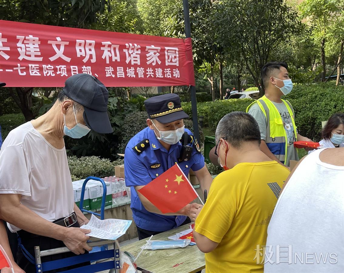9月27日上午,武汉武昌城管执法大队直属四中队携手武汉市第七医院迁建项目施工方,走进徐家棚街道新长江滨江花园小区,开展“迎国庆进社区送健康,共建文明和谐家园”活动。