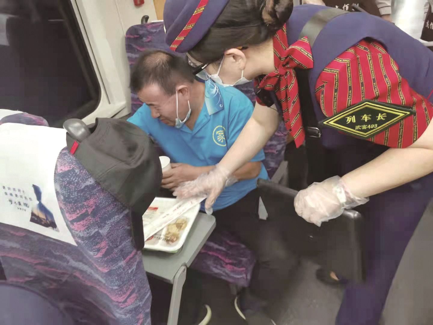 说话间,列车到达安徽金寨站,张婷婷再次询问汪先生是否需要下车救治,汪先生表示自己常年患病随身带了药物,通过列车人员救治后身体状况好转,可以坚持到汉口站下车。于是,张婷婷让列车员徐诗如对其重点照顾。