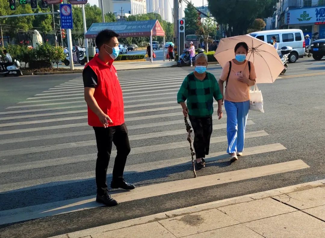 在十字路口,志愿者们对行人文明劝导,红灯停,绿灯行,礼让斑马线、不横穿马路,注意交通信号灯,针对老弱病残孕等特殊人群安全过马路等行为提供帮扶服务,并对过往行人进行交通安全的宣传,引导行人遵守交通规则,倡导广大交通参与者摒弃不文明交通陋习,自觉遵守道路交通安全法律法规,引导居民从自我做起,从身边做起,做一个文明的人,做一个有道德的人。