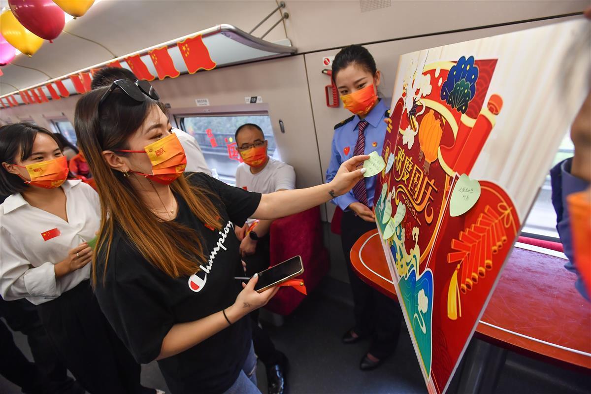 活动最后,乘务员邀请旅客朋友们合影留念,一起在祝福墙上留下祝福话语,祝愿祖国繁荣昌盛。旅客们纷纷表示这次活动激发了他们心中满满的爱国情怀,同时也收获了旅途的喜悦。