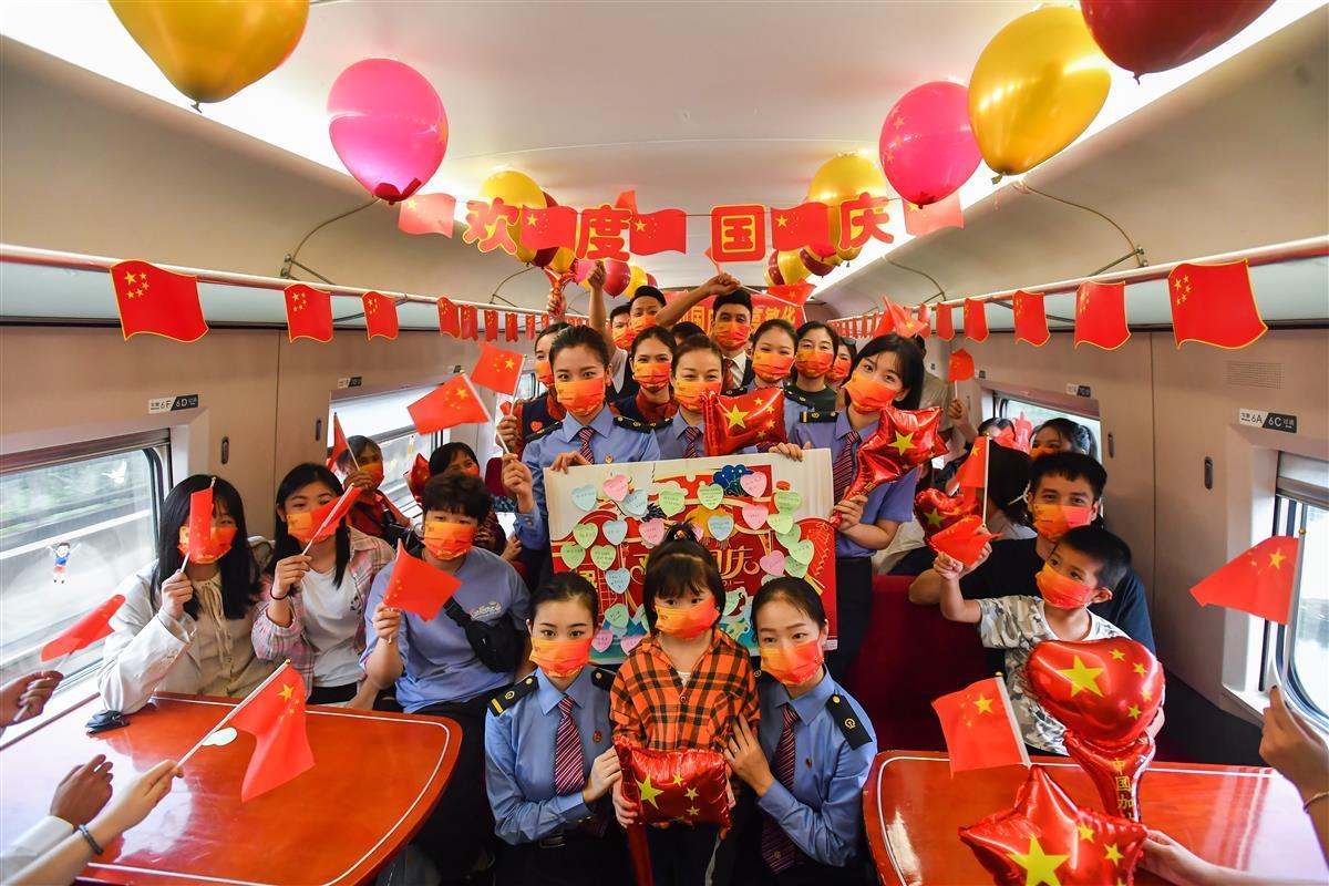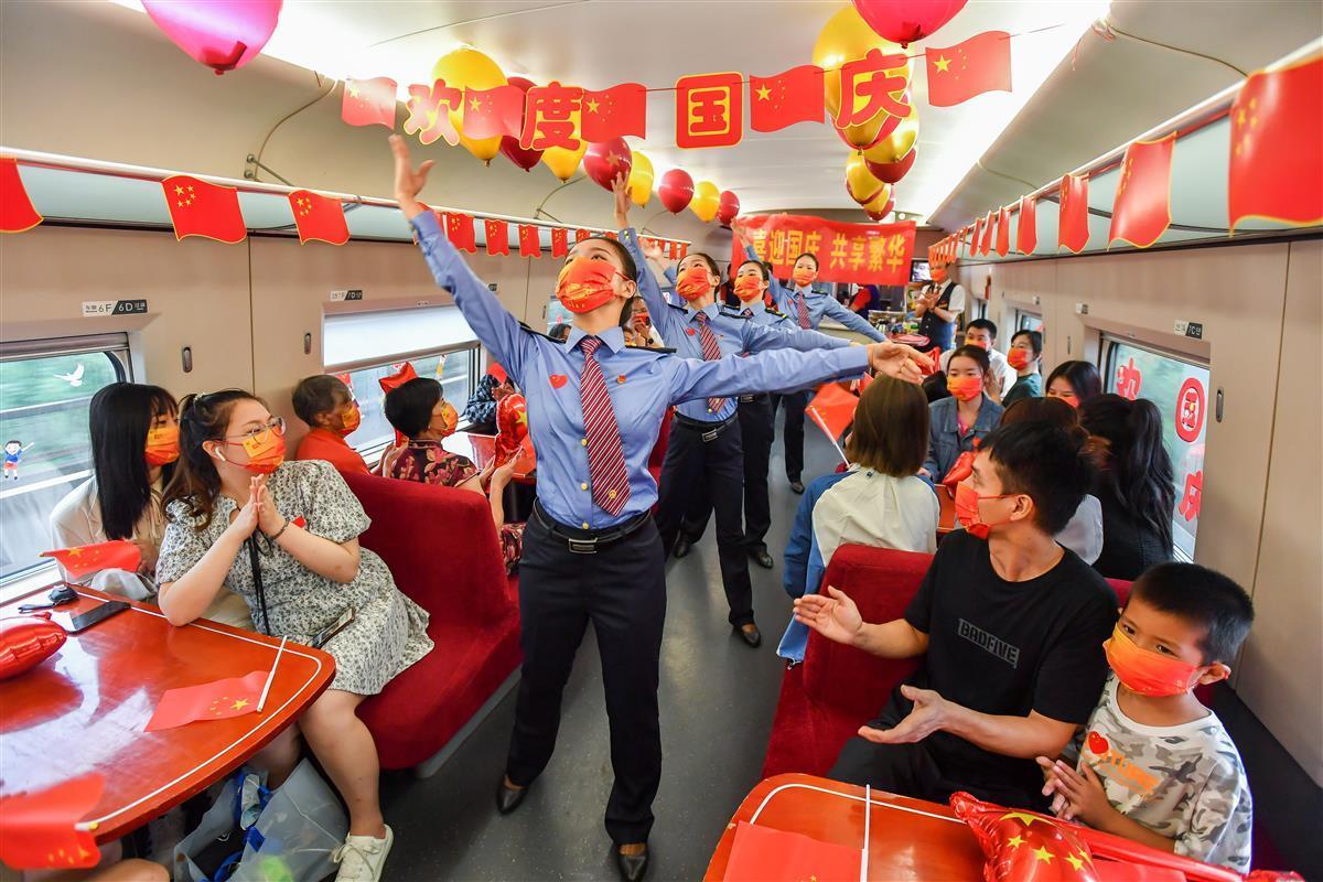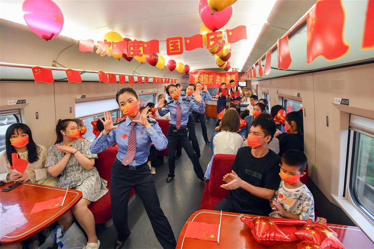 国庆节是举国欢庆的日子,为了给祖国庆生,2021年9月29日,武汉客运段南线动车组车间于在武汉开往深圳北的G1007次列车上,开展了“喜迎国庆 共享繁华”活动,与旅客朋友们共同庆祝即将到来的祖国母亲72周岁生日。列车上,悬挂飘扬的小国旗与精致喜庆的窗花交相辉映,渲染出一片喜庆欢乐的氛围,浓浓的节日气息充满车厢每个角落,每一位上车的旅客都感到舒适欢乐。