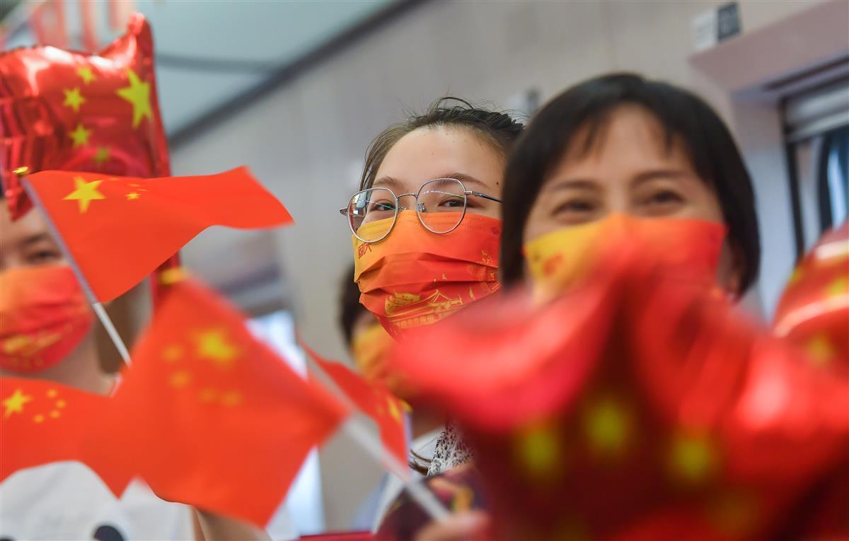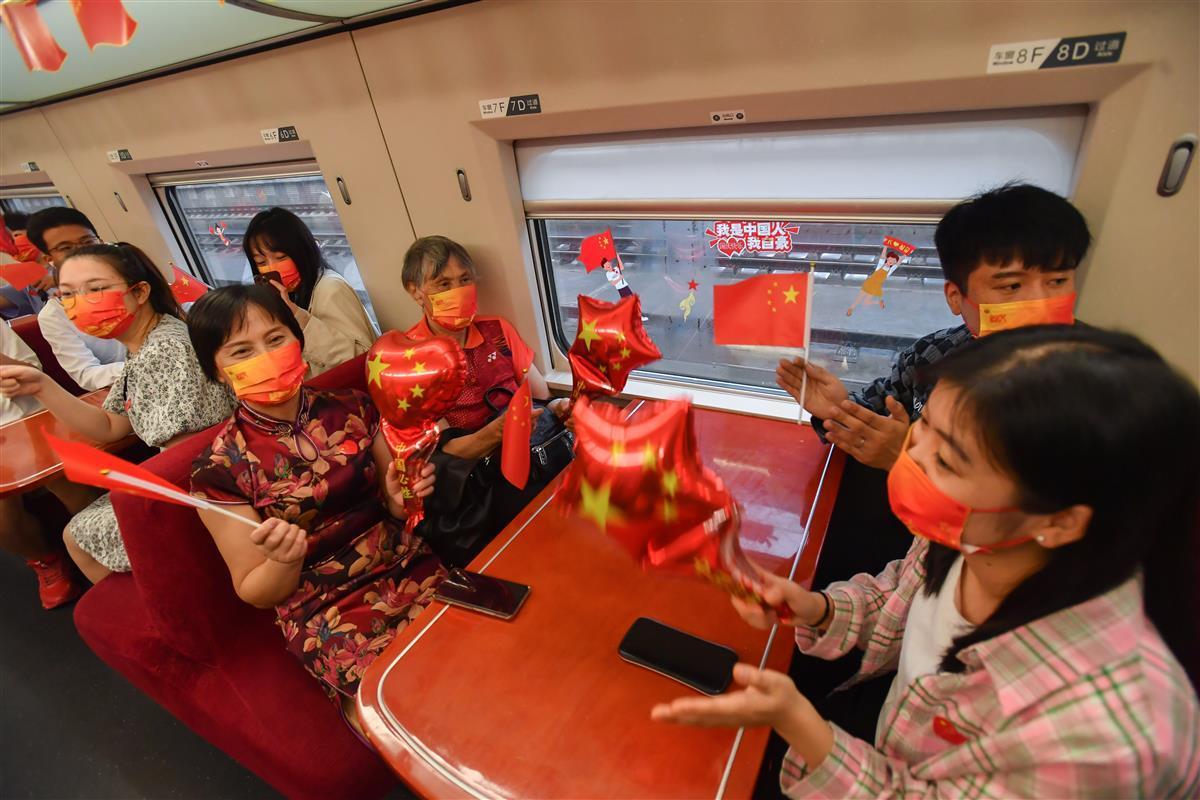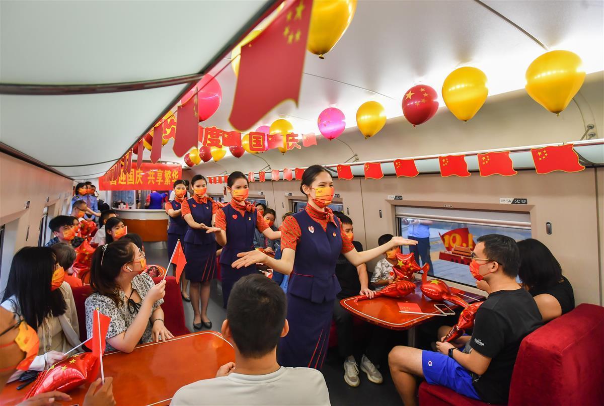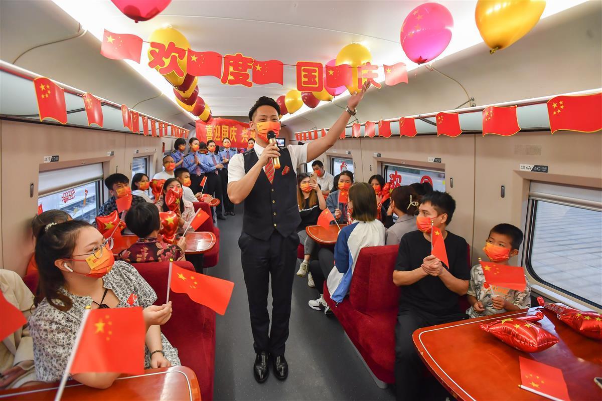 国庆节是举国欢庆的日子,为了给祖国庆生,2021年9月29日,武汉客运段南线动车组车间于在武汉开往深圳北的G1007次列车上,开展了“喜迎国庆 共享繁华”活动,与旅客朋友们共同庆祝即将到来的祖国母亲72周岁生日。列车上,悬挂飘扬的小国旗与精致喜庆的窗花交相辉映,渲染出一片喜庆欢乐的氛围,浓浓的节日气息充满车厢每个角落,每一位上车的旅客都感到舒适欢乐。