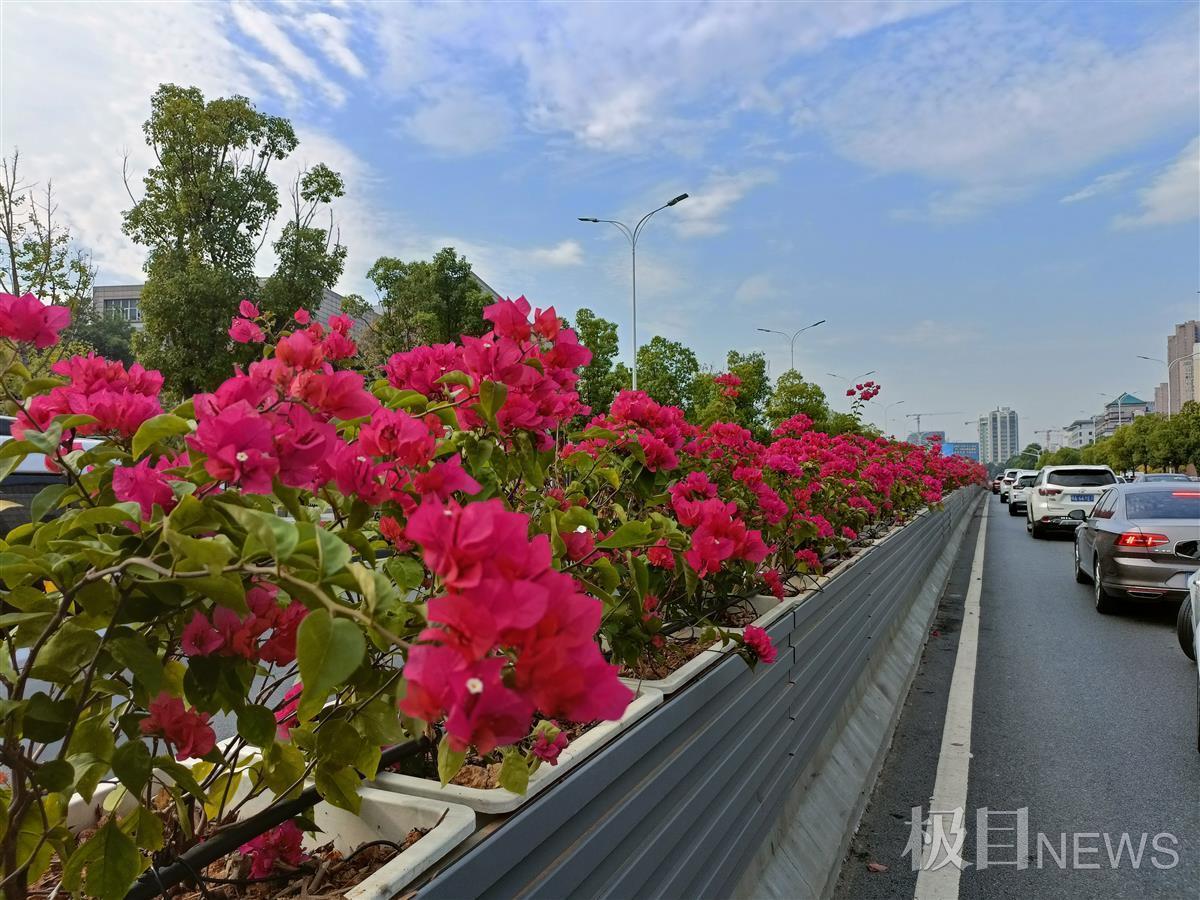 在武昌东湖路梨园至地下通道1500米中分带花箱,已更换三角梅5262余盆;梨园转盘以一串红,孔雀草,牵牛花等时令花卉组合为主,8万盆草花搭配12盆大型三角梅花箱,打造色彩丰富层次分明的景观节点。