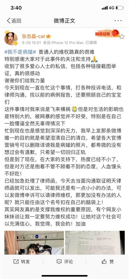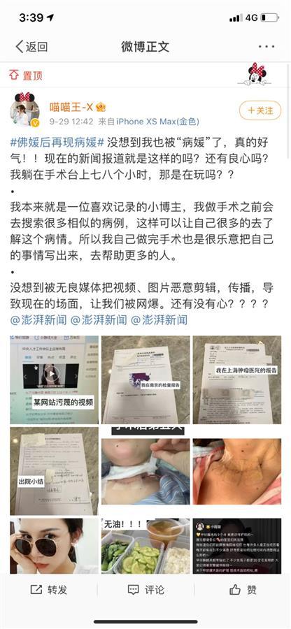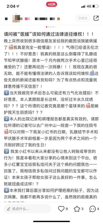 李女士表示,自己昨晚突然在微信上收到很多朋友发来“病媛”的截图,才知道自己在小红书发布的病床照被截图,作为“病媛”案例之一被报道。目前,她在寻求法律途径维权。