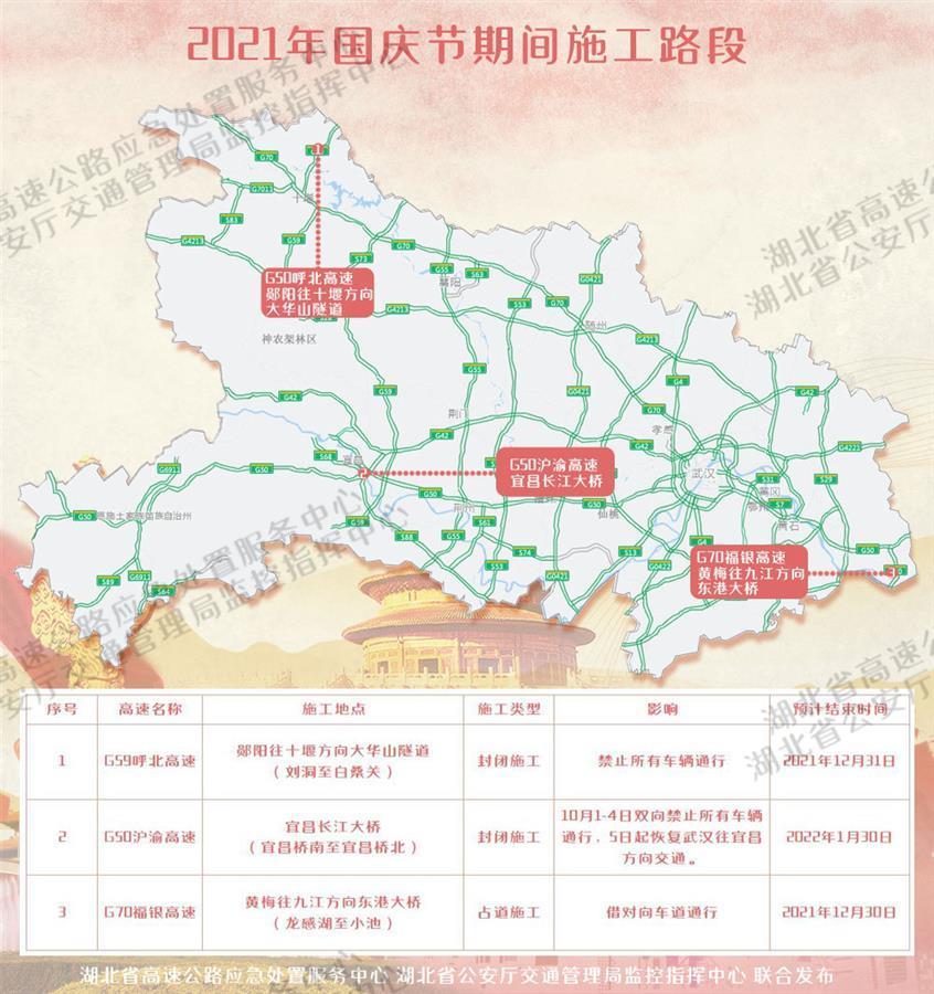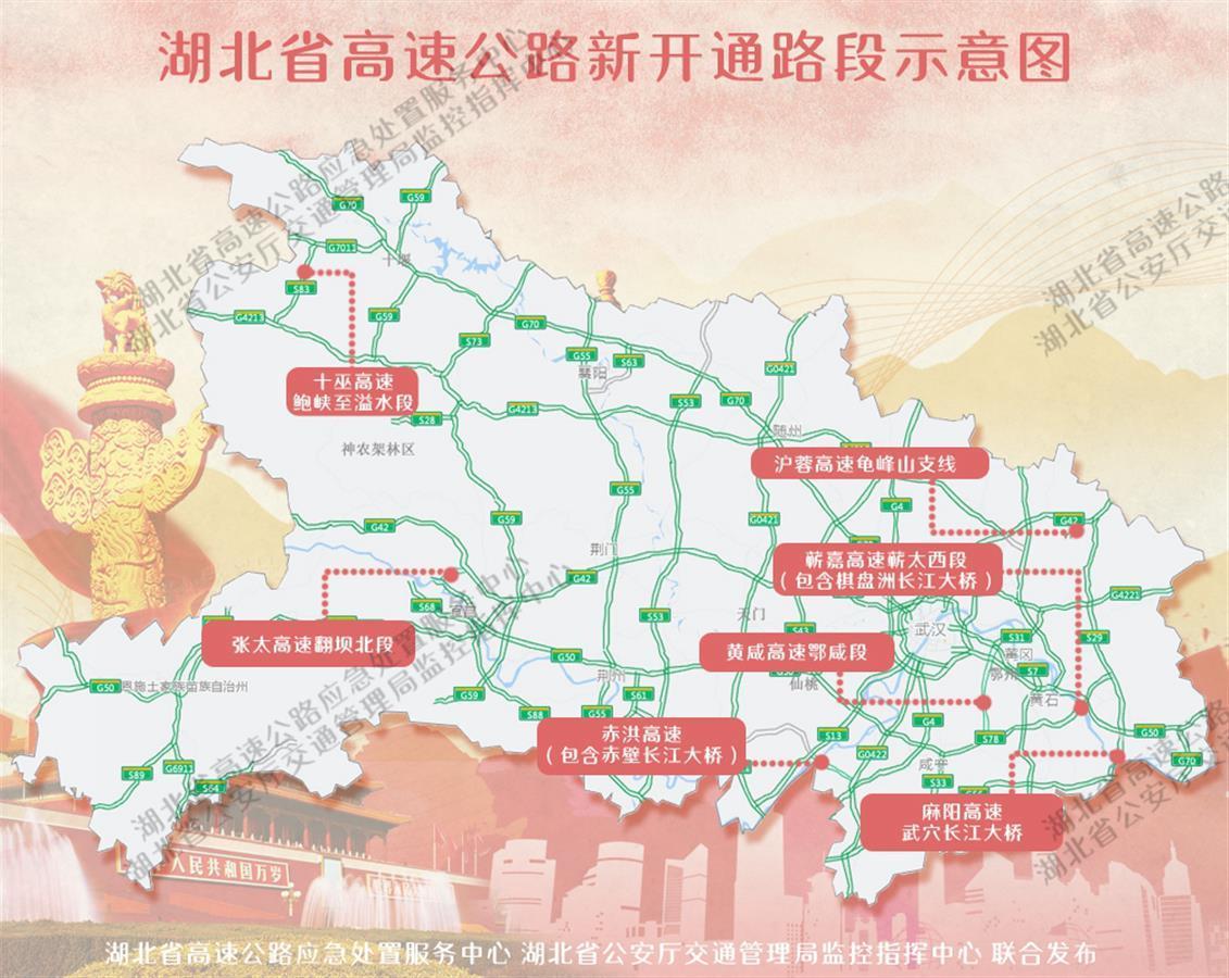 2021年国庆节前夕,十巫高速鲍峡至溢水段、蕲太高速棋盘洲长江公路大桥、蕲太高速蕲春西段、赤洪高速赤壁长江公路大桥、麻阳高速武穴长江公路大桥、沪蓉高速麻城龟峰山支线、张太高速翻坝北段、黄咸高速鄂咸段等项目相继开通,使湖北高速路网更加完善,为社会公众节日出行特别是旅游提供了更为安全便捷的高速通道,同时也为部分路段节日拥堵提供了绕行分流通道,提请司机朋友根据出行需要选择合适的线路出行。