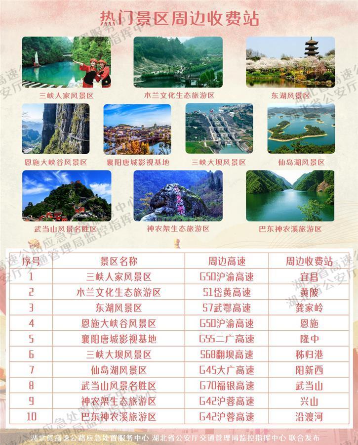 由于国庆假期间自驾游需求激增,湖北省高速公路管理局应急中心根据热门景区邻近收费站流量进行梳理排名,预计今年国庆假期间武汉、宜昌、襄阳、十堰、恩施等地区的热门景区邻近收费站车流量较大。