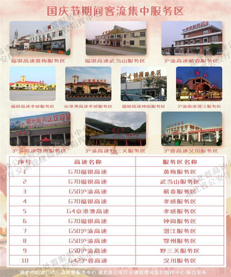 国庆假期自驾游增多,建议公众出行前做好攻略,合理规划线路,及时了解道路通行情况。湖北省高速公路管理局应急中心根据历年来全省高速公路服务区运行数据分析,节假日期间重点时段部分客流集中服务区接待车流量将超过日均数倍,车辆在进入服务区时应严格按照道路标牌和限速牌指引提前变更车道,采取线性减速的方式进入服务区,不要使用急刹和突然变道的方式驶入服务区匝道。