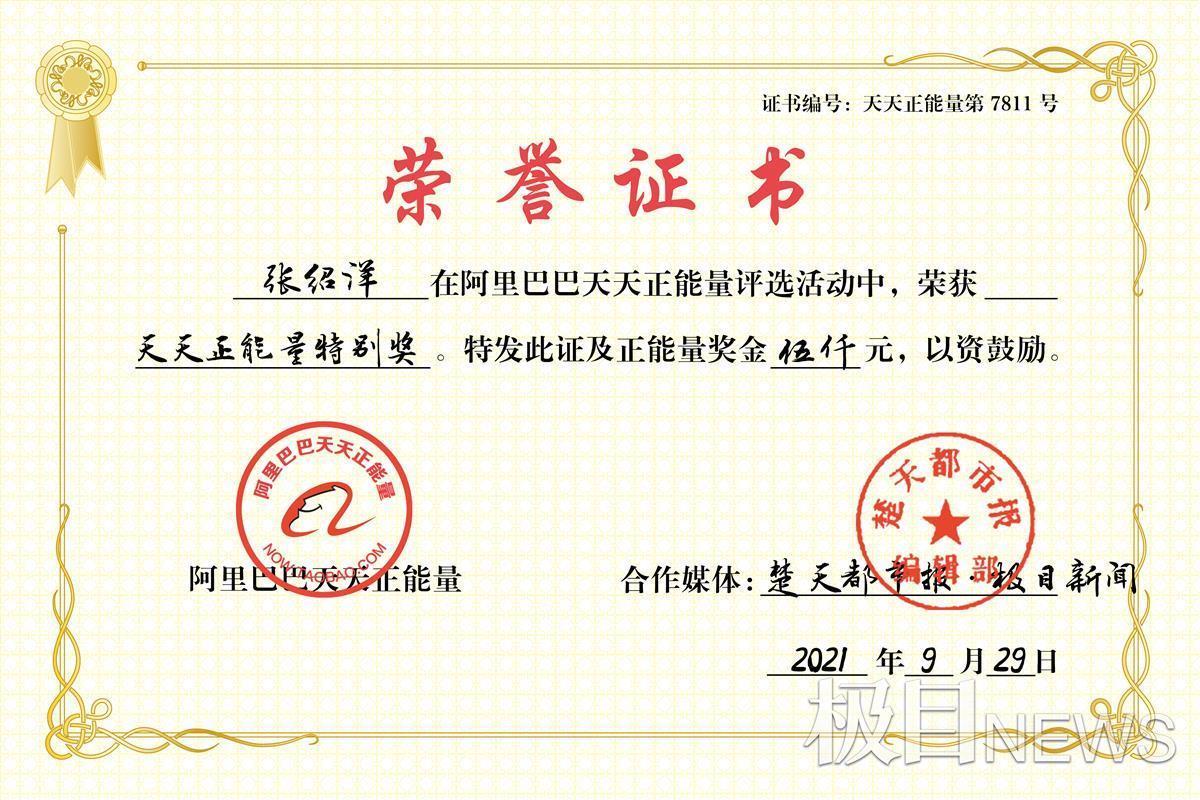 “天天正能量”是阿里巴巴集团联合楚天都市报极目新闻在内的100多家主流媒体共同打造的大型公益开放平台,以“传播正能量、弘扬真善美”为宗旨,面向全社会寻找、奖励凡人善举。目前,天天正能量已奖励8000余名正能量人物,投入公益金7000多万元。此前,楚天都市报极目新闻报道的18年前冒险爬楼救人的李向阳、街头飞奔截停轿车的辅警付波、照顾摔伤邻居的好大姐汪兰、社区爱心送餐妈妈团体等湖北正能量人物都曾获得该奖励。