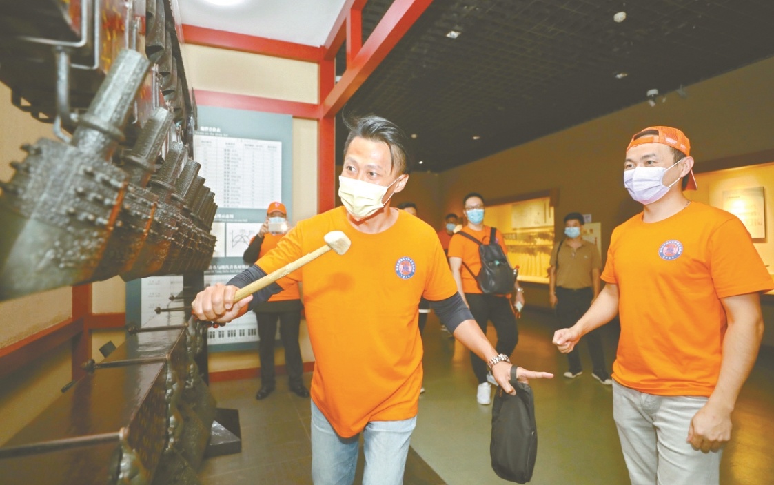 2020年,炎帝故里中华文化研修班学员在随州博物馆敲响编钟。