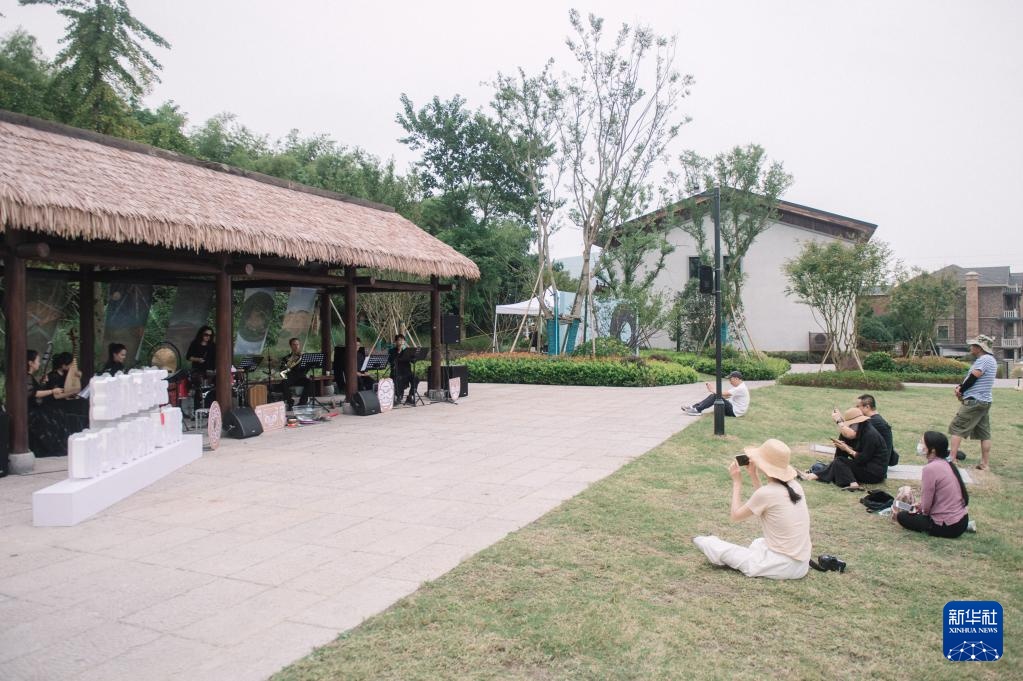 9月29日,游客在瑶山遗址公园内欣赏音乐表演。新华社记者 江汉 摄