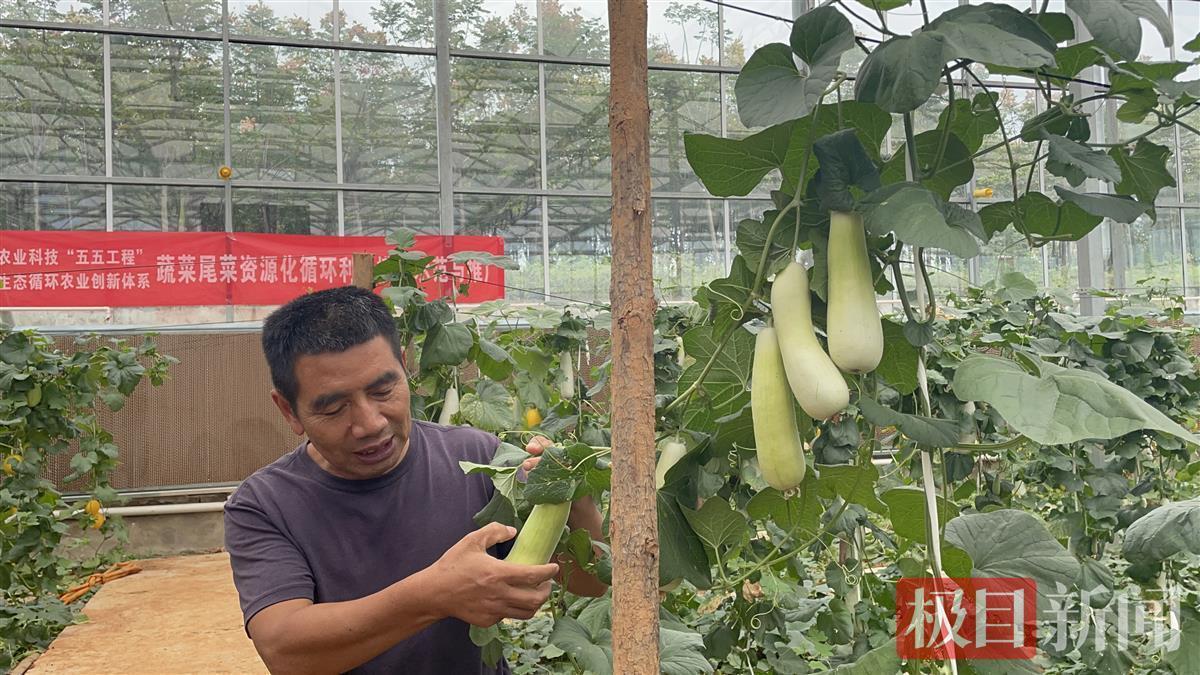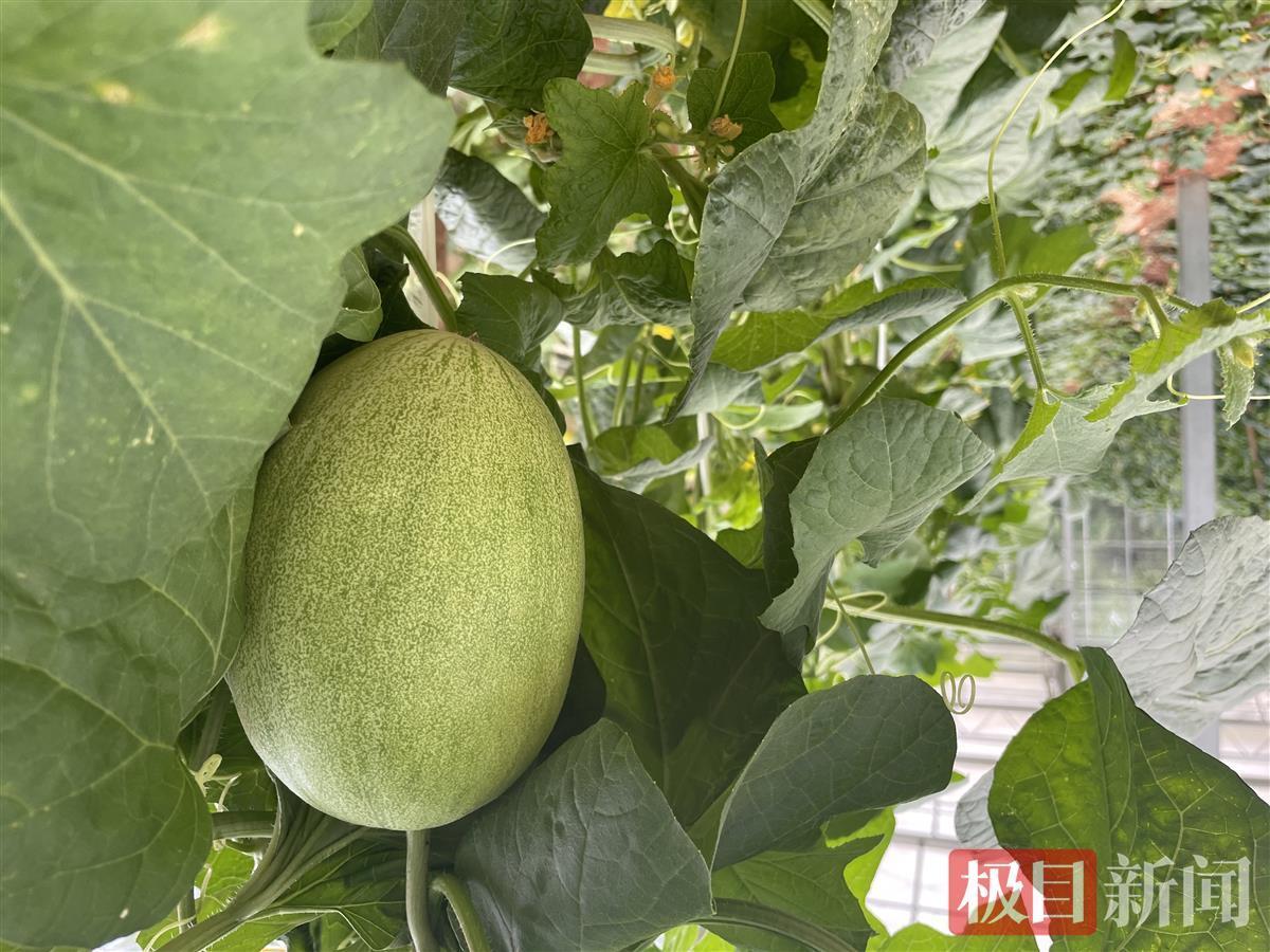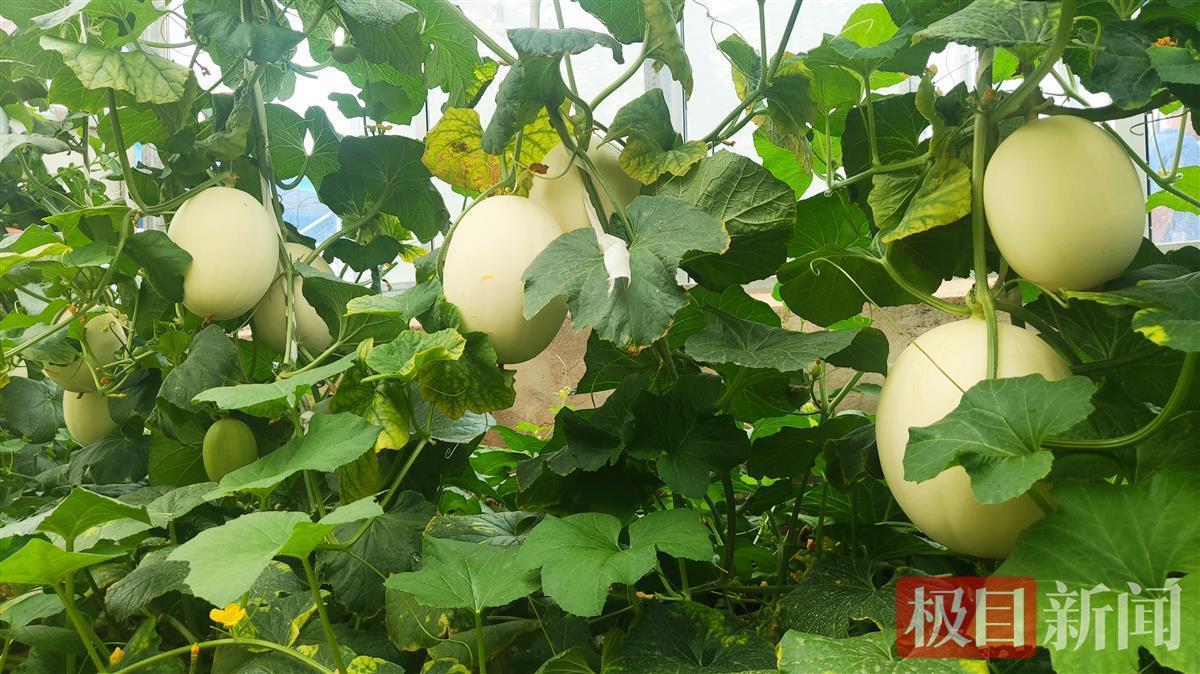“黄色的是黄金蜜露,白色的叫雪蜜……”在专业种植大棚内,武汉市农科院专家李爱成向极目新闻记者介绍。记者发现,瓜藤不是像传统那样在土地上“爬行”,而是沿着特制的杆往上爬。“我们采用的是吊蔓式栽培技术,这样有利于瓜充分均匀受热,提高品质。”李爱成介绍说。