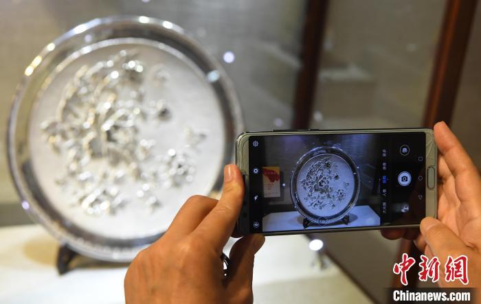 中国工艺美术大师林仕元参展银雕作品《国色天香》吸引参观者观看。 记者刘可耕 摄