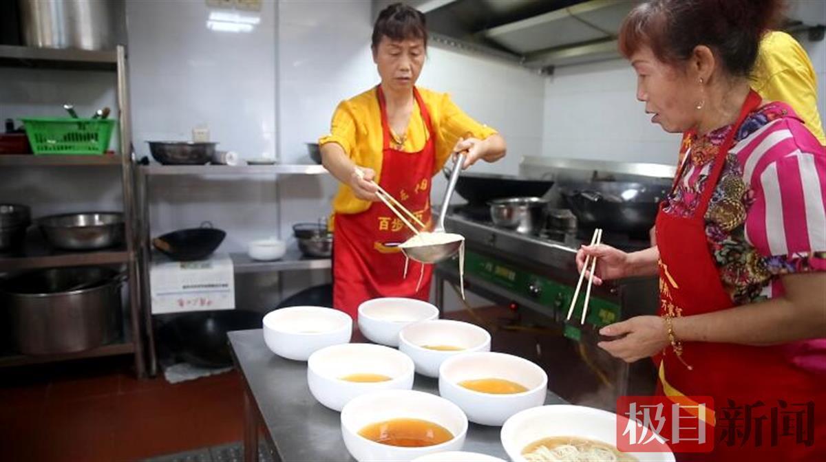 “出锅咯!”在百步亭社区景兰苑爱心餐吧,居民围坐在桌前唱起红色革命歌曲,爱心餐吧志愿者刘久元和程珍华端上寓意美好的幸福“国庆面”,大家同享“国庆面”共祝祖国好。