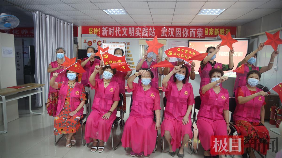 “我和我的祖国一刻也不能分割,无论我走到哪里都留下一首赞歌……”百步亭社区一居委会共享厨房里歌声飞扬,20位与祖国同岁的老人和社区老人代表摇动鲜艳的小国旗一同放声高歌,并创作打油诗共话幸福生活。