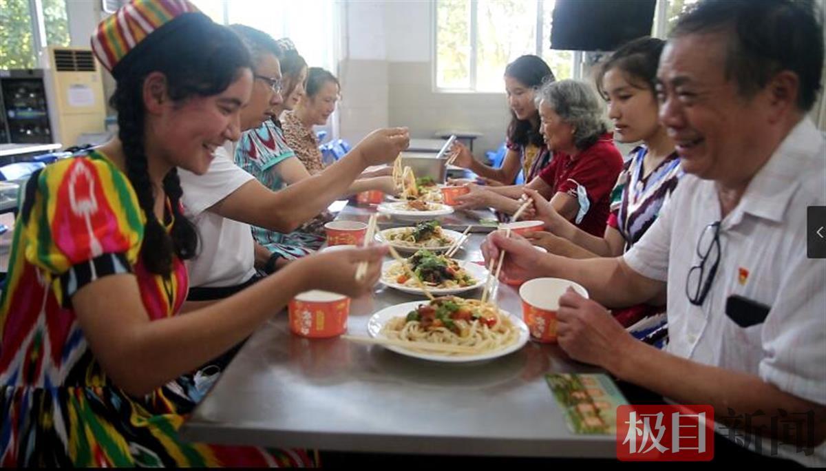 学生们将面一一送到结对老人手中,和老人们一起品尝。就读新疆班高一的巴合江表示,今天做的面让她想到了平时爸爸妈妈做的饭,“吃到嘴里,真的有家乡的味道”。