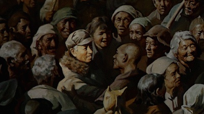 周恩来位于画面的左部,他与老乡之间真切的身体语言的互动,形成了一种情感的联结。