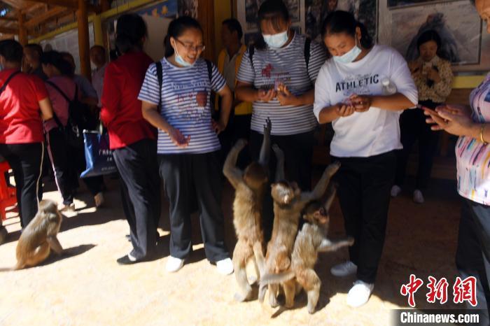 “我们从2000年开始利用猕猴作为资源来发展旅游业。刚开始时,猴子并不像现在和人那么亲近。为了吸引猴子下山,我经常把玉米、红薯等猕猴爱吃的食物,拿到山上猴子经常出没的地方投放。投放的次数多了,猴子才慢慢和我亲近。”罗起跃说。