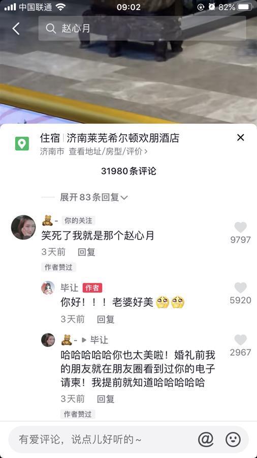 10月1日,新郎毕文鹏的老婆赵心月告诉极目新闻记者,结婚之前就知道当天举办婚礼的酒店,有个新娘和自己的老公同名,毕竟都在莱芜,也都相互认识,“现在和新娘毕文鹏互加了微信,有机会会见面认识。”