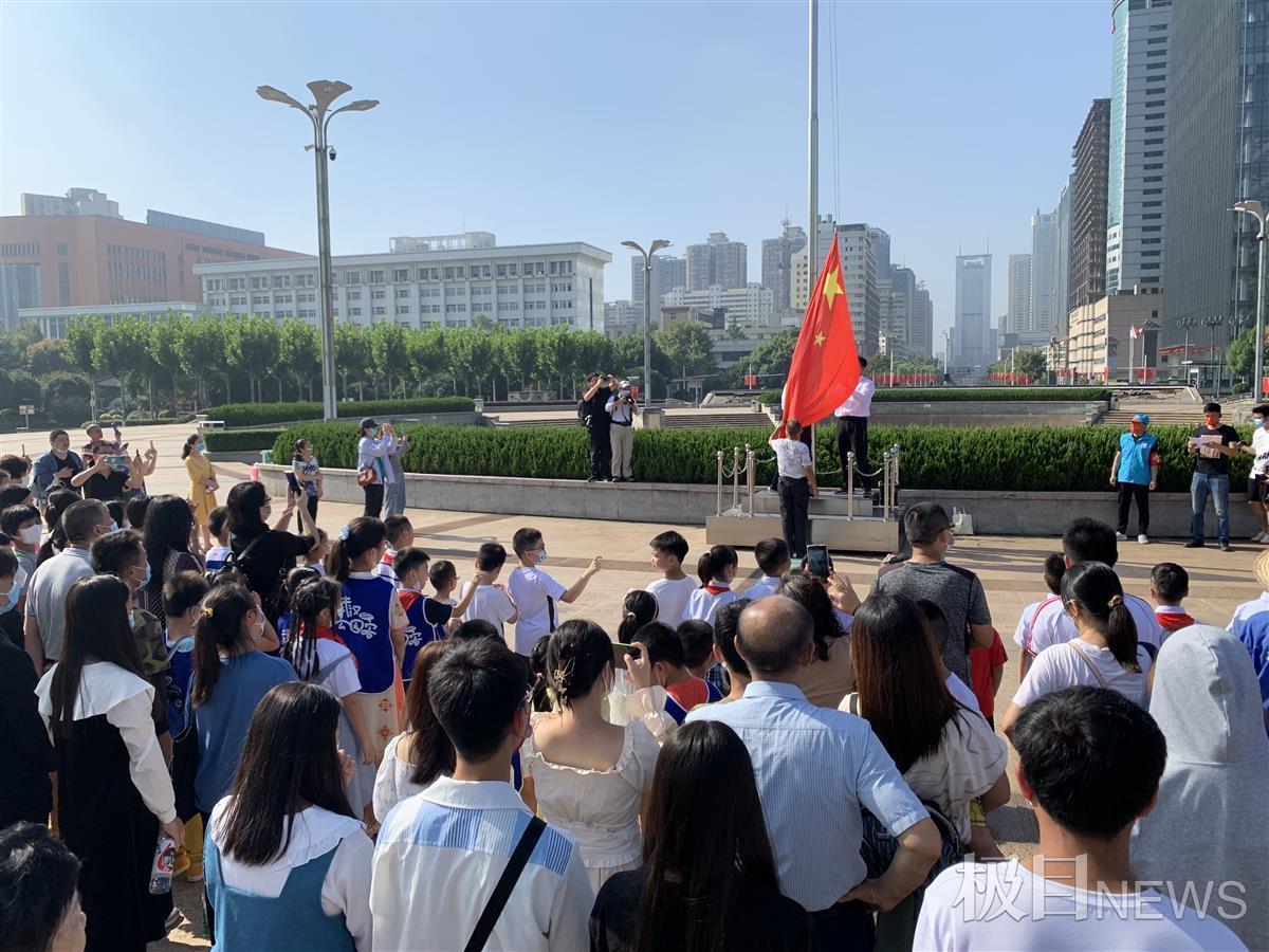 为庆祝中华人民共和国成立72周年,10月1日上午9时30分,武汉洪山广场举行“迎国庆·升国旗”仪式,现场共邀请了20组亲子家庭和广场保安、保洁、园林绿化工人参加,升旗仪式吸引了游客纷纷驻足停留,自发加入升旗仪式当中,向国旗敬礼。