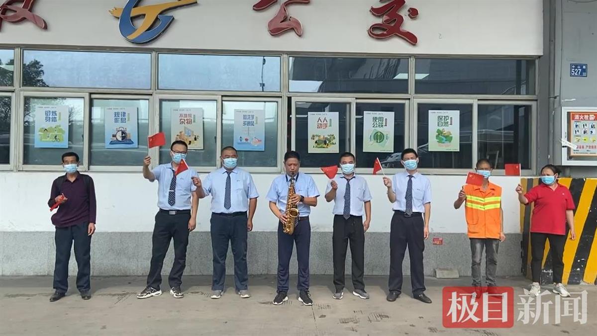 当日上午10时,公交538路驾驶员杜田鑫,用萨克斯吹奏起了“我和我的祖国”,身边一群手持五星红旗的公交“歌手”们从人群中唱着红歌走了出来,悠扬的旋律伴随着歌声,飘荡在整个公交场站内。他们以红歌快闪的方式,庆祝祖国72周岁华诞,用歌声表达对祖国的热爱。不少候车的市民乘客也受到歌声感染,自发挥舞起手中的国旗,加入到合唱队伍。