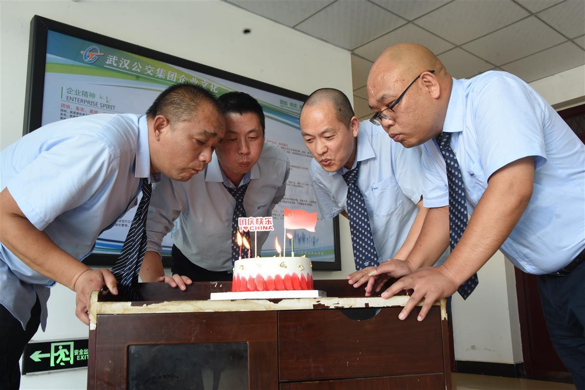 当天上午,周国庆和汪国庆跑完一趟车后,在线路的安排下,来到653路汉城路公交停车场与另外两名国庆相聚。10时,已到齐的4人被喊到了停车场办公楼大厅内,只见桌子上摆放着一个插着小国旗和国庆快乐标语的蛋糕。“今天国庆节,祝你们节日快乐!。”653路线长陈钢说道。 随后,一起吹生日蜡烛、与同事们吃上香甜的蛋糕,紧接着与国旗合影,4名“国庆”动情不已。
