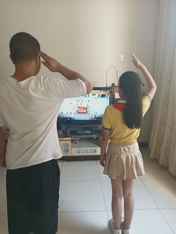 五年级(2)班学生汤珞琛是学校国旗班的升旗手,今天在家和爸爸一起参加了升旗仪式。平时老师说的要整理仪容仪表,身体站正,注视国旗,用饱满的热情唱国歌,她都一丝不苟地教给了爸爸。父女俩一起参加升旗仪式,感觉心里暖暖的:“有国才有家,愿我们的日子和和美美,祥和安宁!”