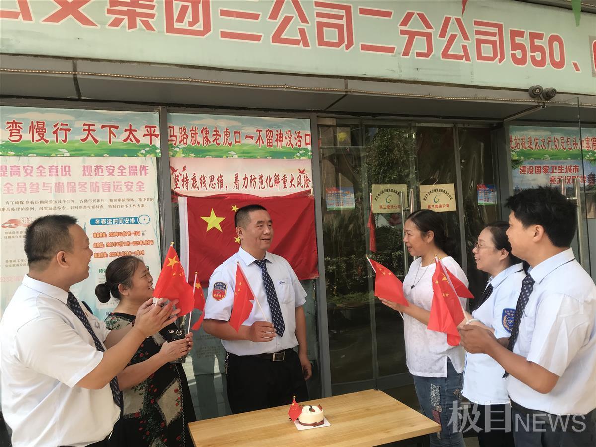 张庆红打开蛋糕,同事们围过来,大家拿着国旗一起唱起了《祝你生日快乐》《我和我的祖国》,准备坐车的乘客也都加入进来。
