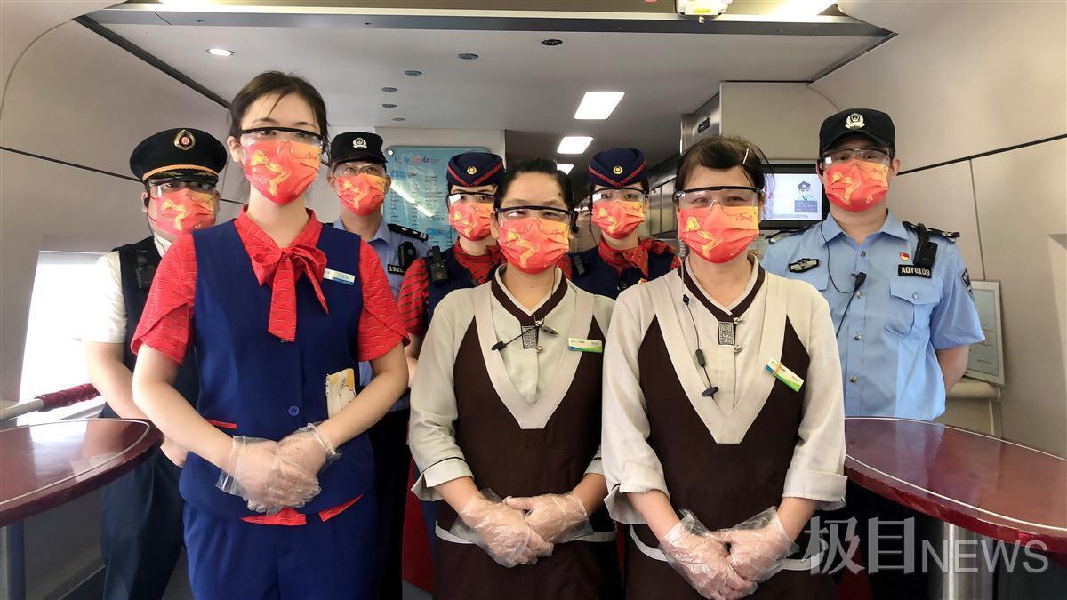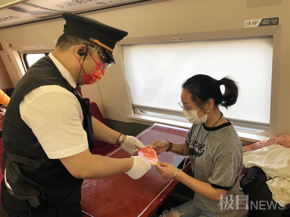 列车工作人员为旅客赠送“中国红”口罩,共庆国庆佳节