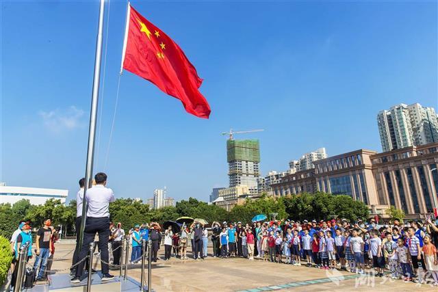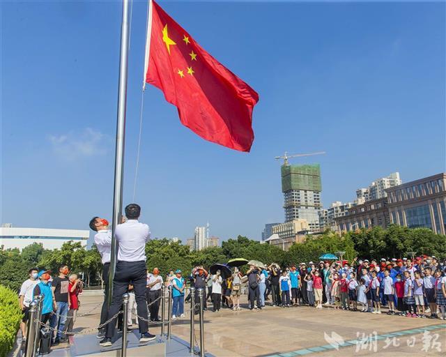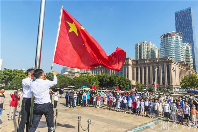 10月1日上午9点30分,洪山广场举行“迎国庆·升国旗”仪式,共邀请20组亲子家庭和广场保安、保洁、园林绿化工人参加,升旗仪式吸引了游客纷纷驻足停留。鲜艳的五星红旗在嘹亮的国歌声中冉冉升起,人们面向国旗齐唱国歌,表达对祖国的无限忠诚与热爱。(湖北日报全媒记者梅涛 摄)