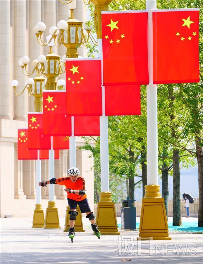 10月1日上午,汉口江滩一元路广场上,70岁的李金玉正在一排国旗下练习轮滑,今天,他特意穿上了一件大红色的外套,矫健的身姿引得路人纷纷喝彩;武昌昙华林,四名女大学生骄傲地向记者展示她们自制的国旗口罩……