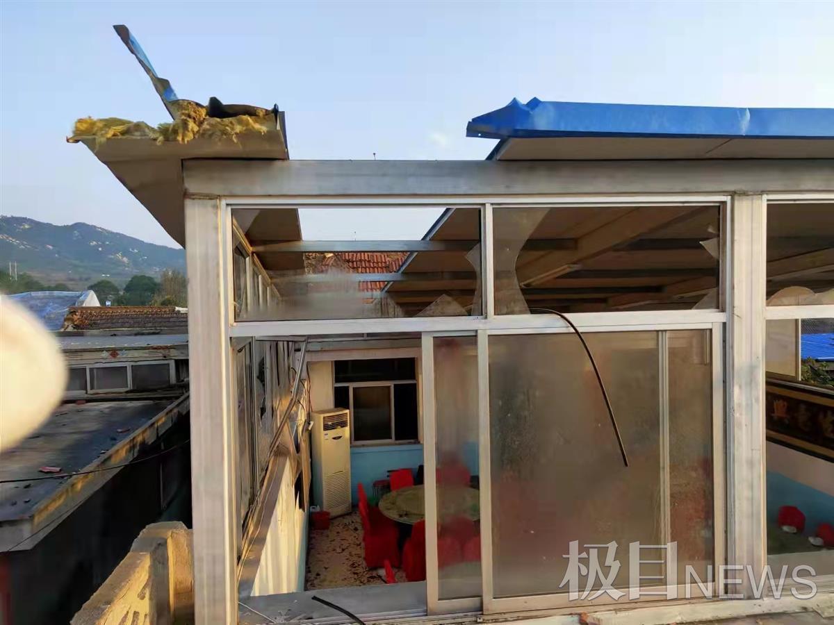 一村民的农家乐屋顶被大风掀掉一块,玻璃基本被大风刮起的杂物击碎