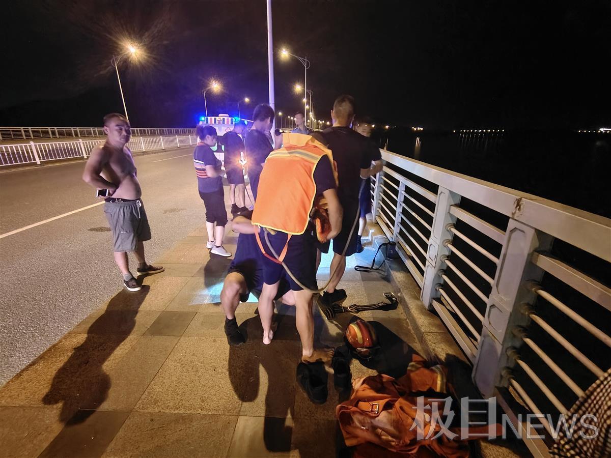 10月1日傍晚7时6分,湖北省武汉市蔡甸区高湖大桥处,一男子因家庭纠纷跳入湖中。接到报警后,武汉消防蔡甸新农站立即出动1台抢险救援车、7名消防员赶赴现场营救。