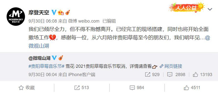 还有个别音乐节在开演前临时取消。9月30日,原计划于10月1-2日举办的贵阳草莓音乐节突然宣布取消,同样是出于疫情防控要求的考虑。