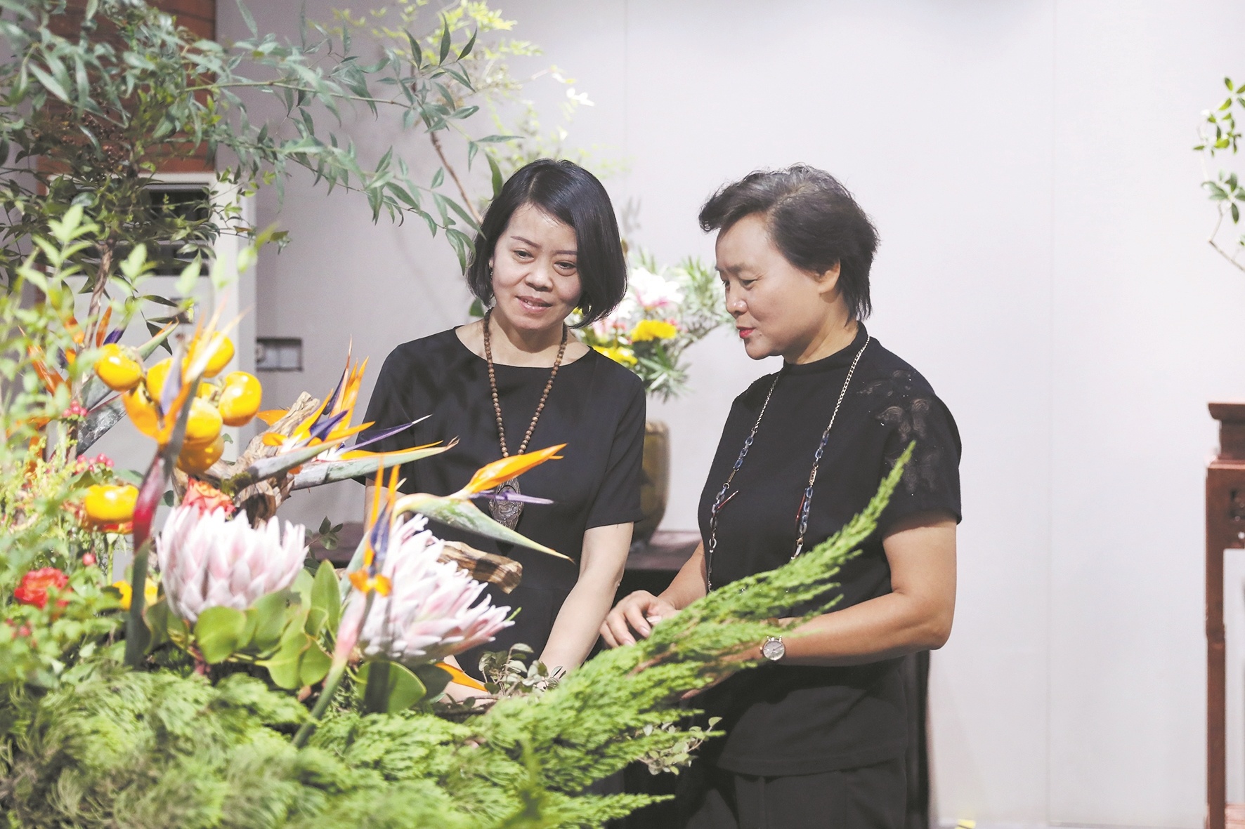 苏艳玲(右)为观展者讲解汉派插花艺术