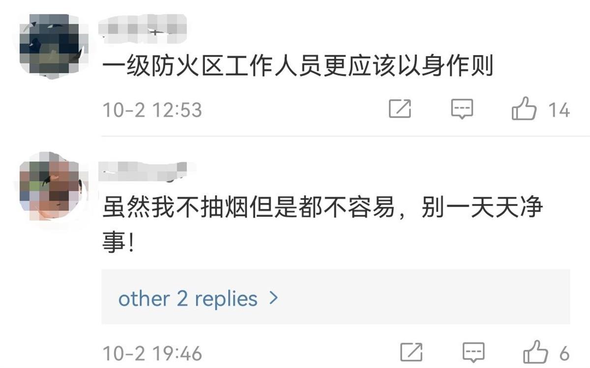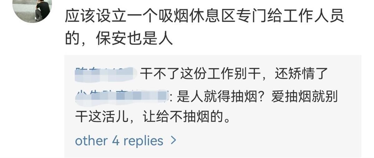 但也有网友提出了自己的建议,对可能被开除的保安表示同情,甚至嫌拍摄者多事:“国庆假期,保安要上十几个小时班,在保证安全的前提下,可以设置户外吸烟区给工作人员。”“拍摄者什么心理?现在的人有点事就拍照,就上网。”