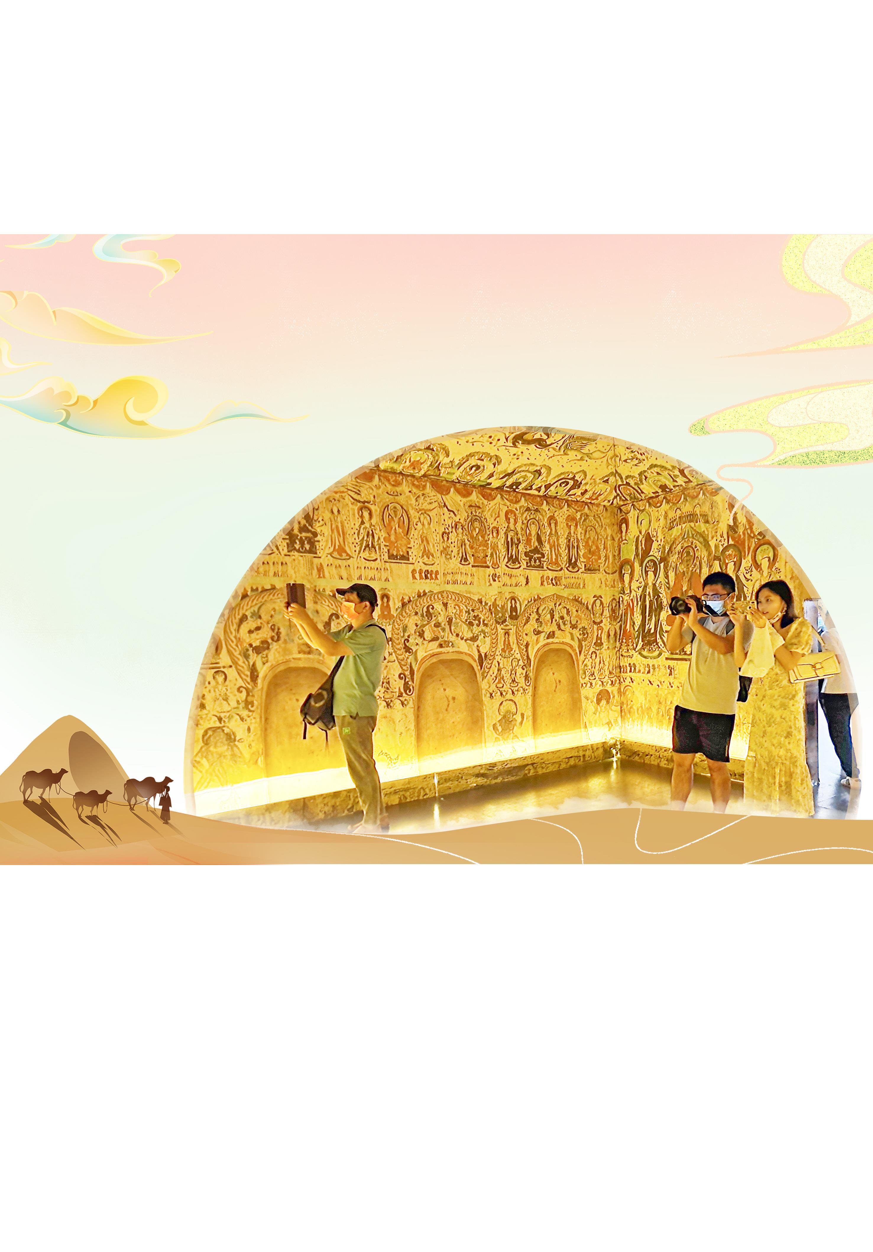 昨日,众多游客来到武汉园博园,打卡长江文明馆,参观“敦煌壁画艺术精品公益巡展”。本次展览为期3个月,展出敦煌石窟数字化高保真复制壁画精品66幅,1:1复制敦煌西魏第285窟、元代第3窟、藏经洞第17窟和2尊彩塑、20套依据敦煌壁画服饰仿制的服装、敦煌藏经洞出土的经卷复制品,以及相关多媒体作品、敦煌纪录片等。