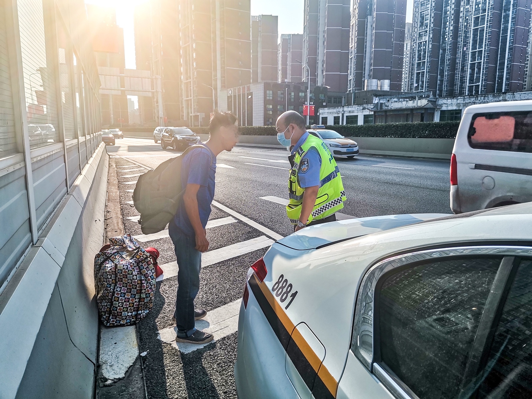 10月2日下午4时40分许,武汉市洪山区交通大队民警行至欢乐大道高架桥时,发现一名男子背着行李,站在路边伸手拦车。
