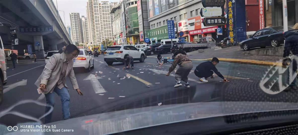 刘先生的行车记录仪和拍摄的视频显示,一处城市道路上散落着大量的现金,纸币被风吹得不断翻滚。一名女司机停车后连忙下车帮忙捡钱,一名穿着灰色外套的女士手上捏着钱伸手拦下路过的车辆,一辆环卫车停下后,下来一名男子也连忙俯身捡钱。附近还有数人蹲着捡钱,捡起的大把现金均被递给拦车的灰衣女士,仅仅约两分钟,在众人的努力下散落的现金均被拾起归还,灰衣女士则对着帮忙的人不断鞠躬作揖。