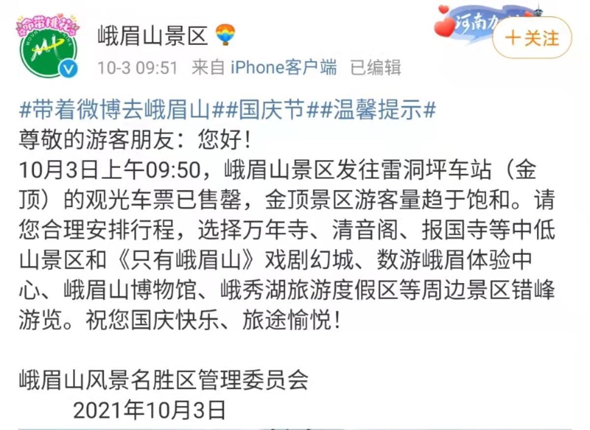 除了泰山风景区,全国多地景区也紧急发布通知。据四川峨眉山景区消息,10月3日上午不到10点,峨眉山景区发往雷洞坪车站(金顶)的观光车票已售罄,金顶景区游客量趋于饱和。景区请游客合理安排行程,选择中低山景区和周边景区错峰游览。