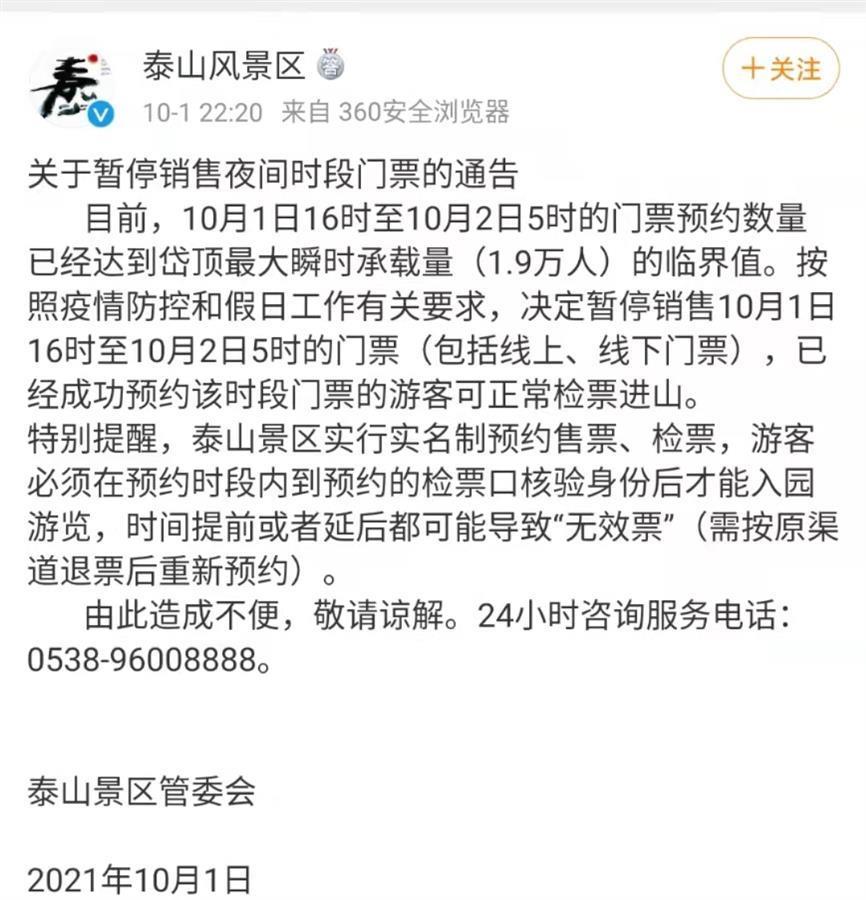 10月1日晚10时许,泰山风景区发布暂停销售夜间时段门票的通告。通告称,1日下午4时至2日上午5时的门票预约数量,已经达到岱顶最大瞬时承载量(1.9万人)的临界值。按照疫情防控和假日工作有关要求,决定暂停销售该时段的门票(包括线上、线下门票),已经成功预约该时段门票的游客可正常检票进山。
