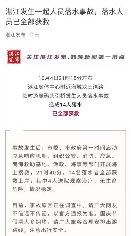 事故发生后,市委、市政府第一时间启动应急响应机制,组织公安、消防、应急、南海救助基地、渔政、海事等部门开展海上搜救,21时40分,14名落水者全部获救上岸,其中4人送院观察治疗,无生命危险,情况稳定。